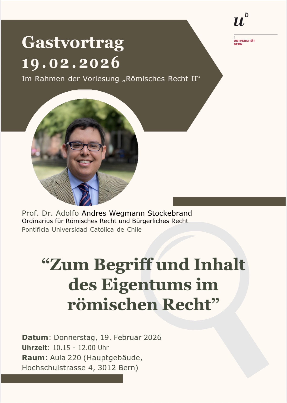 Am 19. Februar 2026 findet um 10:15 Uhr in der Aula 220 die Gastvorlesung "Zum Begriff und Inhalt des Eigentums im römischen Recht" von Prof. Wegmann statt.